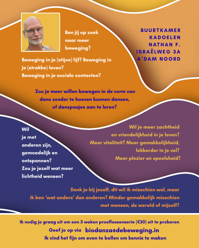 Zou je misschien met ons mee willen gaan op biodanzareis? Een wekelijks kort avontuurtje van anderhalf uur, waarbij je steeds wordt uitgenodigd om vanuit verschillende soorten muziek jezelf in beweging te laten zetten. Alleen, samen met iemand, met de hele groep. Elke muziek, elke dans, elke bewegingsoefening kan een nieuwe ervaring zijn. Een deur, een klein podiumpje voor jou alleen, een nieuw soort ontmoeting met iemand anders.